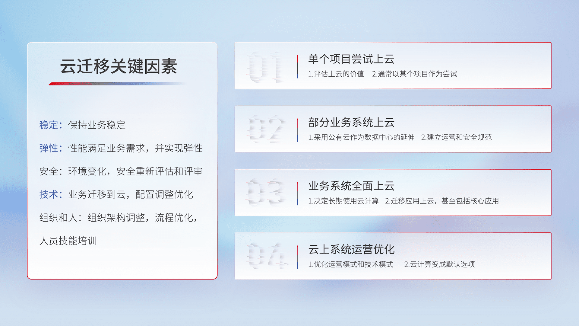 结合实际业务,,,,从规划设计、、云平台选型、、、云原生改造、、、、数据迁移、、、、集成交付,,,,迁移全过程为客户识别最佳上云路径,,,,做好风险识别管理,,,,设计网络架构、、身份权限、、、安全审计合规、、操作审计、、、日志审计、、监控告警策略、、多站点容灾设计等,,,对云上基础设施进行整体规划,,提升IT治理水平,,以满足弹性、、、、高可用、、、、高性能的需求。。