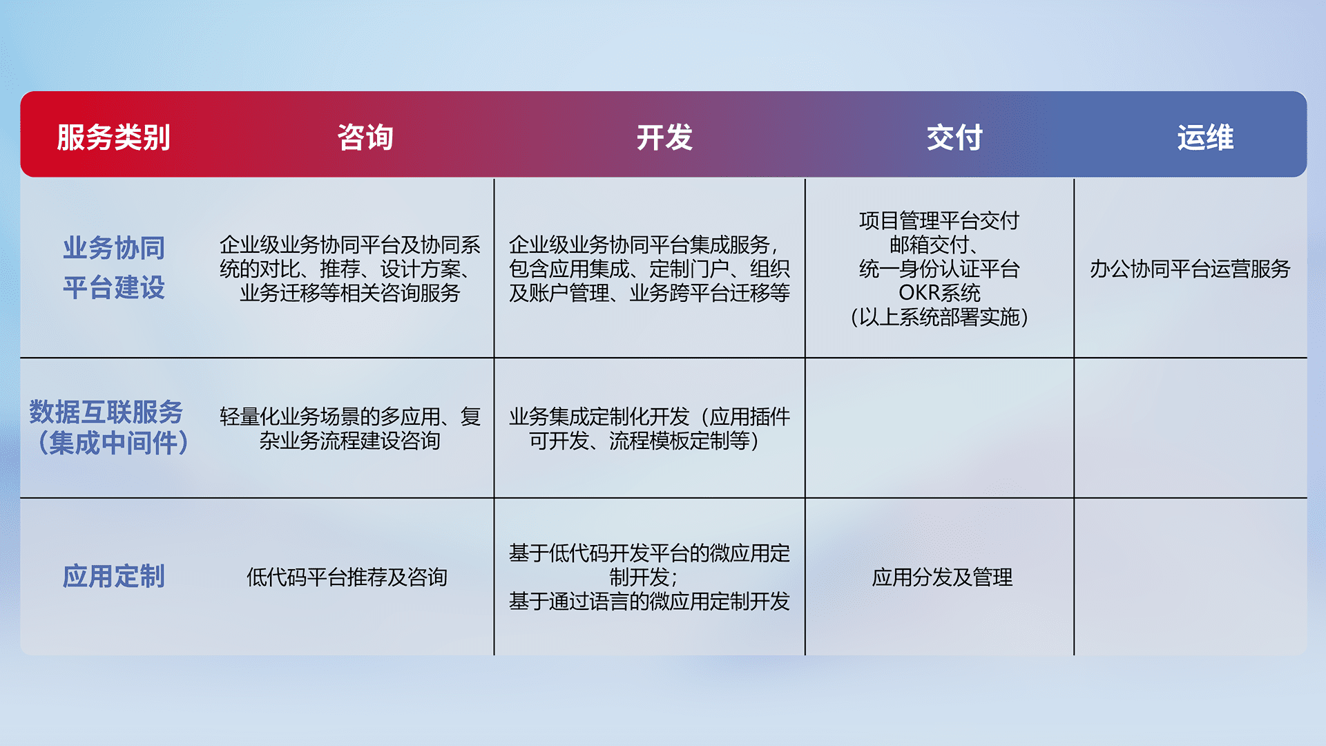 针对钉钉、、、、企微、、、、IDaas等平台级产品提供产品的规划、、、、方案、、、交付、、、、定制化开发等服务,,实现如统一协同办公、、智能客户服务、、、混合会议管理、、、智能数据查询、、等业务场景,,,,实现数字化转型。。。